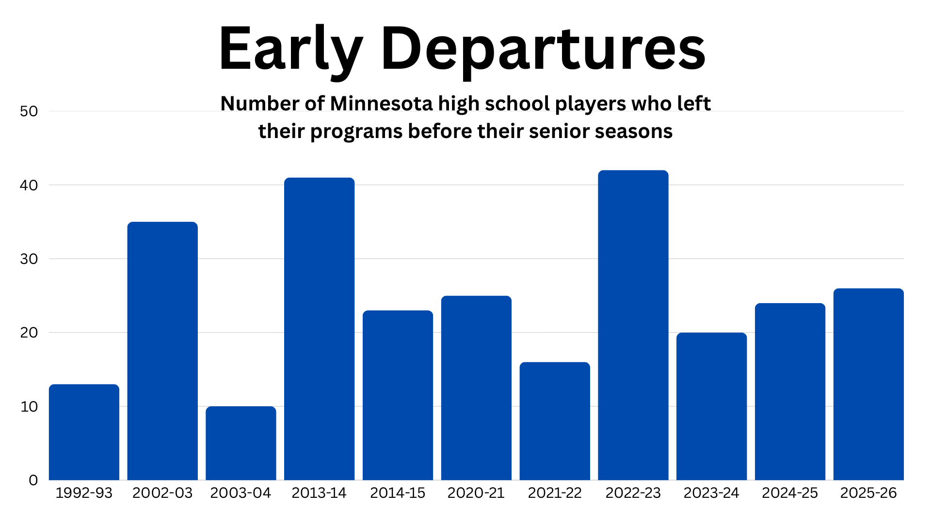 Early departures, a phenomenon dating to the early 1990s as players seek more rapid ascension to higher levels, has mostly held steady at roughly 25 leaving for other opportunities for at least the last two decades. Last season there were 24. In 2023-24 the number dipped to 20. The number of early departures spiked to 42 in 2022-23. A similar exodus occurred before the 2013-14 season. In what was described as a record at the time, 41 players left their high school teams before their senior seasons.